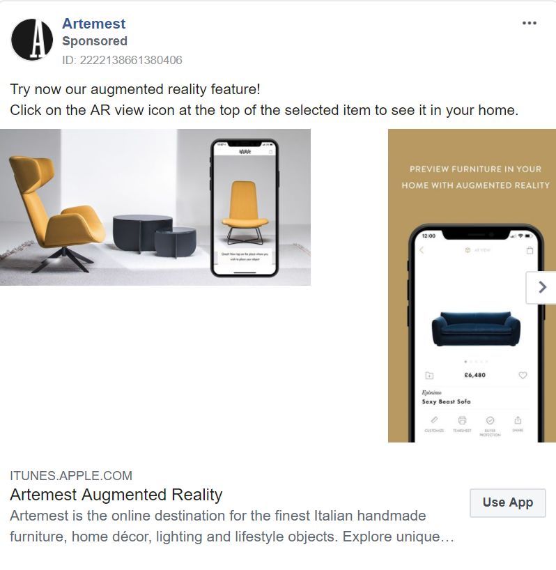 Uncommon among our other brands, Artemest brings the furniture industry into the 21st Century by utilizing tech to drive sales. They’ve invested in an App with augmented reality, allowing potential customers to envisage the products within their homes. With beautiful products, it’s likely that everyone who uses this service will find a piece they love. Seeing is believing and where other ads have urged you to picture living in their rooms, this App brings Artemest’s products into your home.