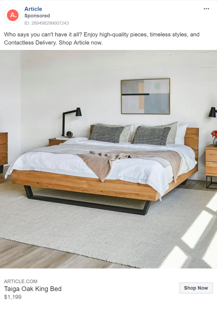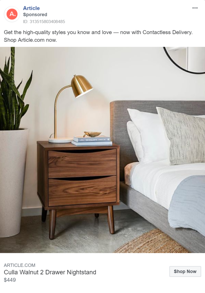 Finally, their messaging addresses one of the more recent barriers to purchase – Covid-19. As a result of the virus, many people are concerned about having strangers in their home and some governments forbid it. With most large furniture items needing to be delivered, the worry of delivery men bringing disease into people’s homes is a concern for many. Article expertly addresses this concern by offering contactless delivery.