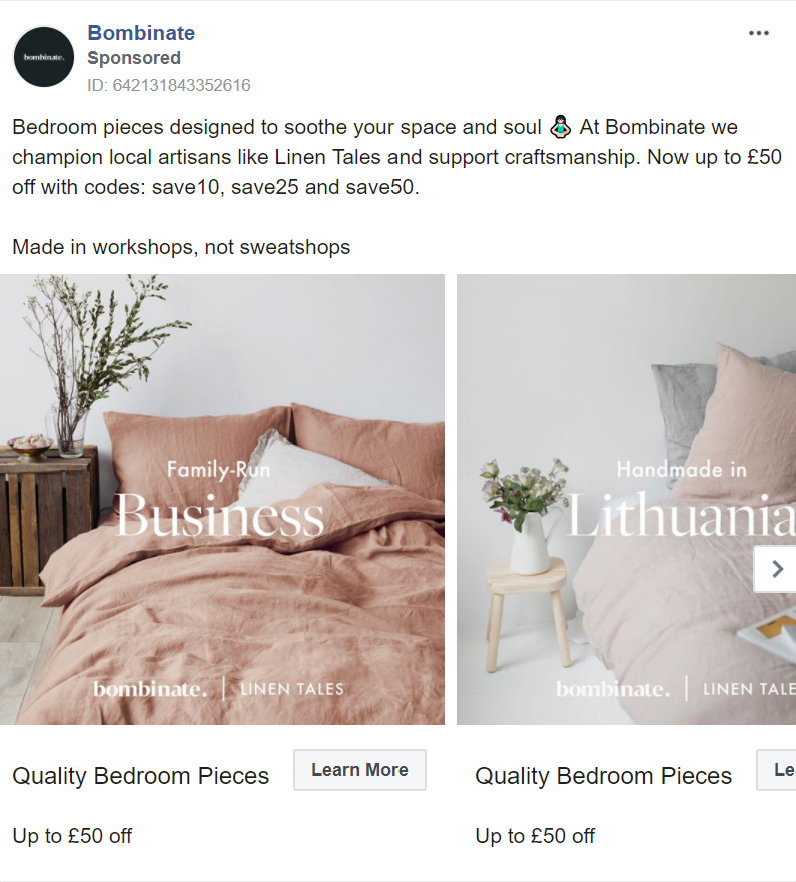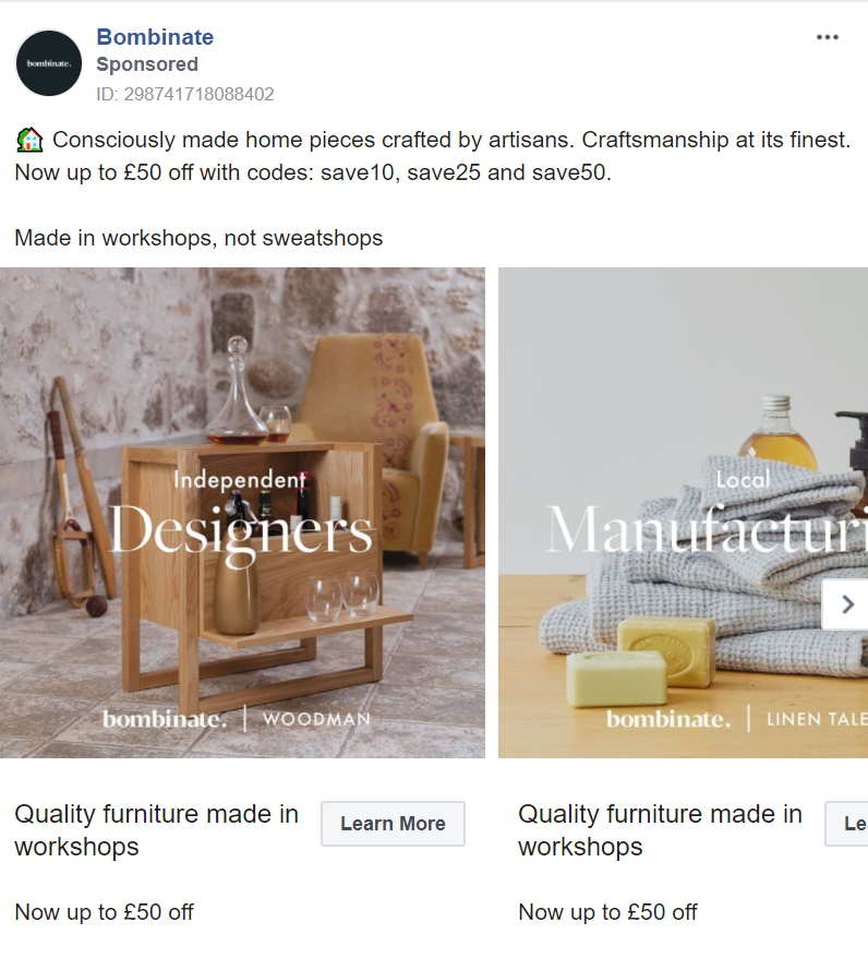 Bombinate uses the carousel feature to highlight its various selling points. From being a family-run business to using independent designers and local manufacturing, the carousel allows them to use a variety of messaging in one ad. These messages promote the craftsmanship that goes into each product, boosting its perceived authenticity, originality and (most importantly) its value.