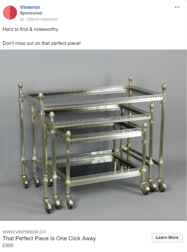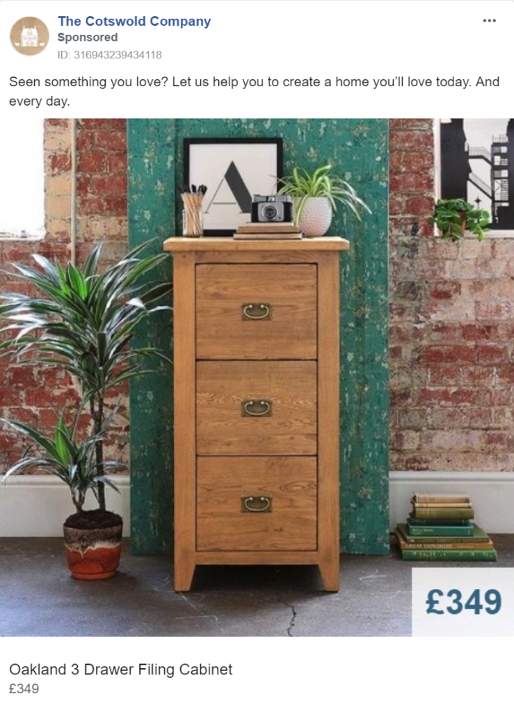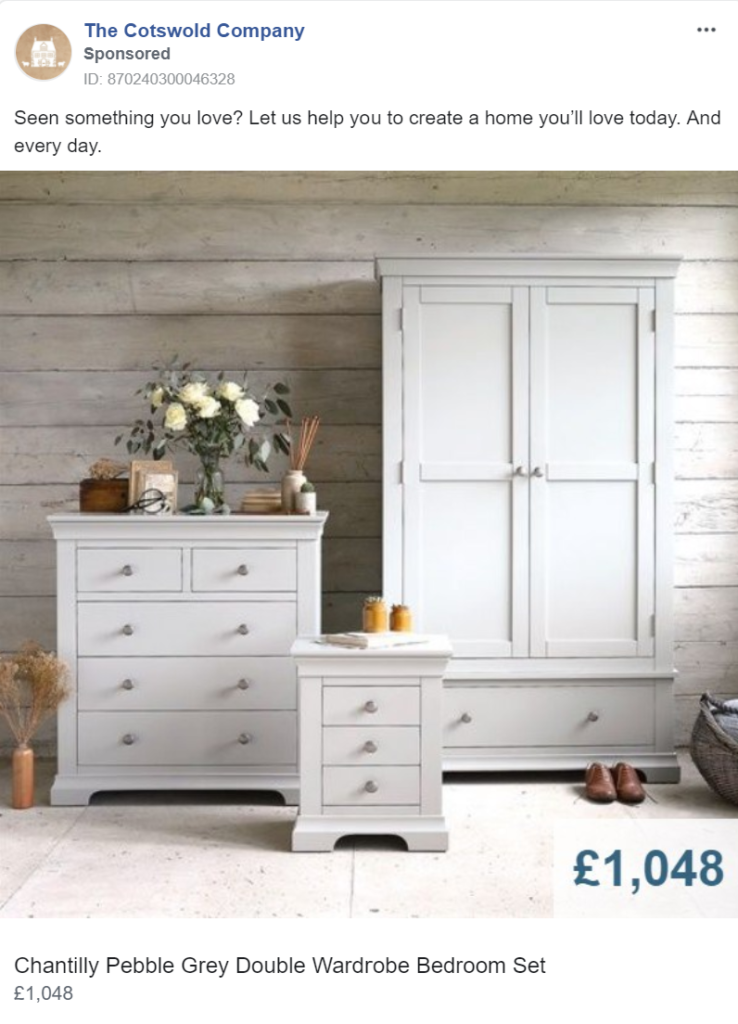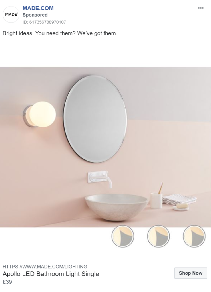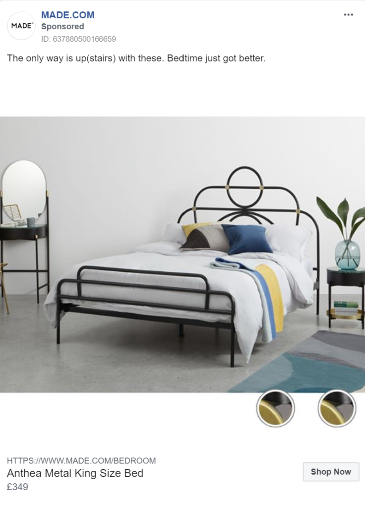 MADE.com perfectly team a variety of products in their ads, allowing them to cross-sell several pieces instead of solely promoting one item. By doing this they not only increase the potential return on ad spend, but they also make their products look more appealing.