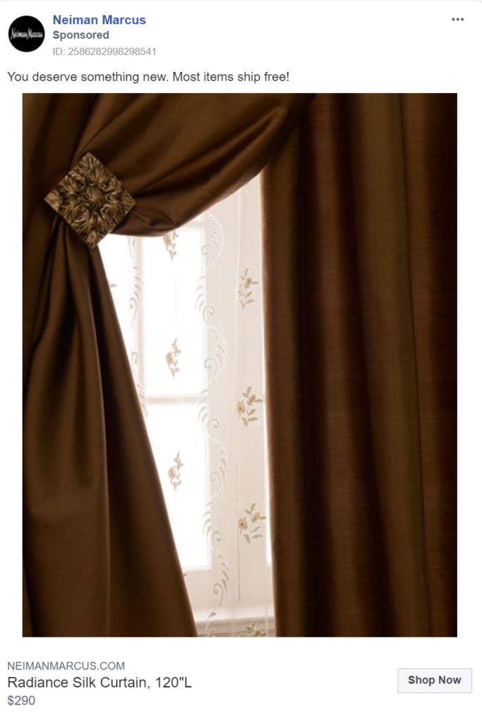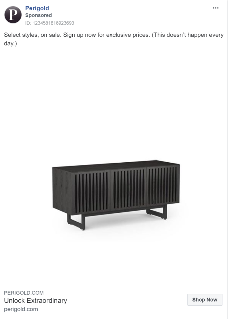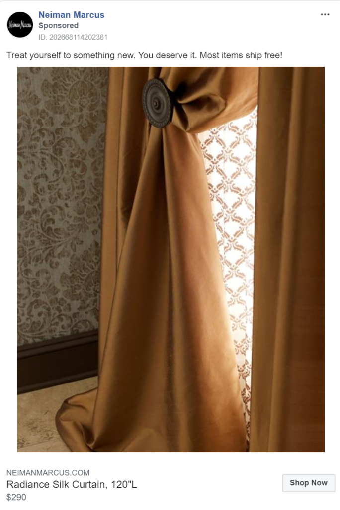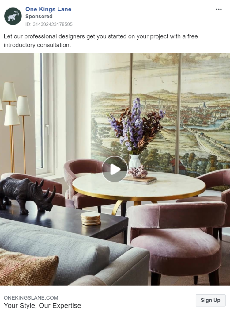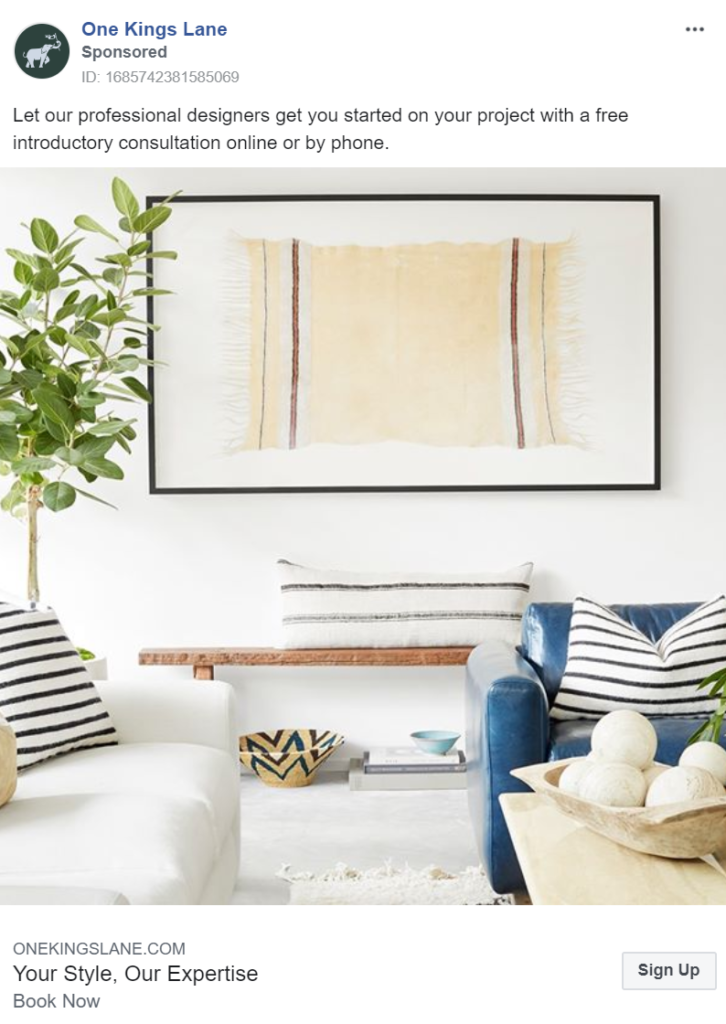 One Kings Lane’s advertising campaign uses all three mediums (images, carousels and videos) to display its products to customers, giving them a greater chance at separating themselves from competitors.